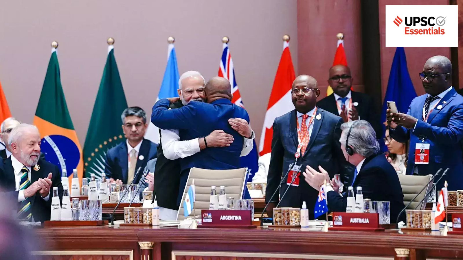 Prime Minister Narendra Modi hugs President of the Union of Comoros and Chairperson of the African Union (AU) Azali Assoumani as the latter takes his seat after the Union became a permanent member of the G20 during the G20 Summit 2023 at the Bharat Mandapam, in New Delhi, Saturday, Sept 9, 2023. (PTI Photo)