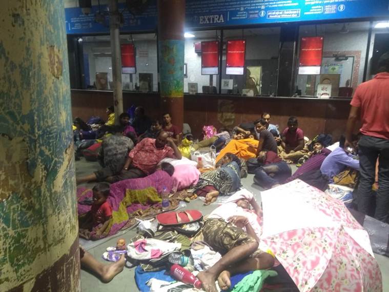 Passengers stranded at the Thane railway station since Sunday night. As heavy rains lashed Mumbai and suburbs, at least 12 trains were cancelled, with many others being terminated or diverted or rescheduled.