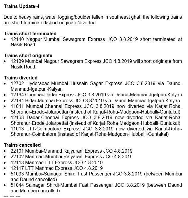 The South Central Railway on Monday morning cancelled at least 18 trains running through Maharashtra due to heavy rainfall in the state. On Sunday night, at least 12 trains were cancelled, with many being diverted or shortly-terminated or re-scheduled.