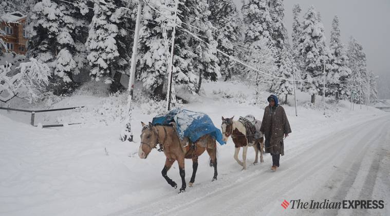 Season’s first snowfall in Gulmarg (Express photo by Shuaib Masoodi)