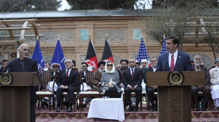 US Secretary of Defense Mark Esper, right, and Afghan President Ashraf Ghani, speak during a joint news conference in presidential palace in Kabul, Afghanistan, Saturday. (AP Photo)