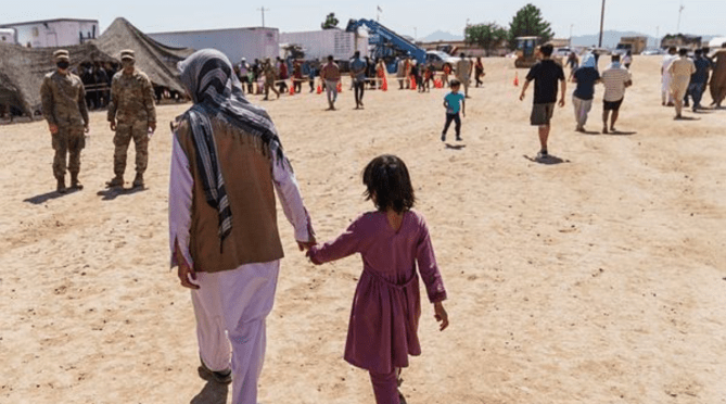 A man walks with a child through Fort Bliss' Doña Ana Village where Afghan refugees are being housed, in New Mexico, Friday, Sept. 10, 2021. (AP)