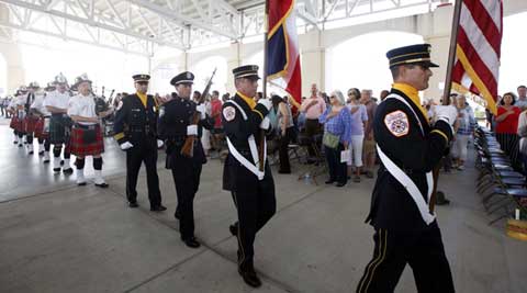 A joint Gulfport Police and Fire Departments honor guard post the colors during the Katrina 10 Year Remembrance in Gulfport, Miss., Saturday, Aug. 29, 2015. (AP Photo)