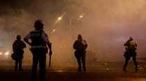 A law enforcement officer watches as tear gas is fired to disperse a crowd protesting the shooting of teenager Michael Brown in Ferguson. (Source: AP)