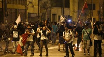 In Lima, some of the more than 5,000 marchers clashed with tear gas-hurling police, pelting them with sticks and stones and setting fire to trash in street bins.