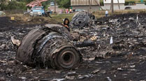 In an effort to clean up some of the carnage, body parts have been washed off the pot-holed road where they fell to the earth, along with parts of the fuselage and wings showing the red and blue Malaysia Airlines logo.