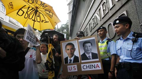 FILE – In this June 15, 2013 photo, supporters of NSA leaker Edward Snowden hold portraits of U.S. President Barack Obama, left, and Chinese President Xi Jinping during a demonstration outside the Consulate General of the United States in Hong Kong, accusing the U.S. government of infringing people’s rights and privacy. (Source: AP)