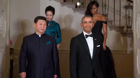 President Barack Obama, Chinese President Xi Jinping, first lady Michelle Obama and Jinping’s wife Peng Liyuan descend the Grand Staircase as they arrive for a State Dinner, Friday, Sept. 25, 2015, at the White House in Washington. (Source: AP Photo)