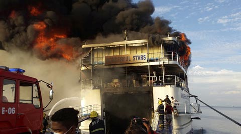 Black smoke rises from the burning MV Wonderful Stars ferry which caught fire at the port in Ormoc city in central Philippines early Saturday, Aug. 15, 2015. (AP Photo)