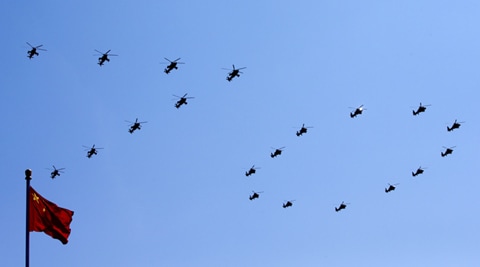 Chinese army attack helicopters form a number “70” flying past a national flag during a military parade to commemorate the 70th anniversary of the end of World War II in Beijing Thursday Sept. 3, 2015. (AP Photo/Andy Wong, Pool)