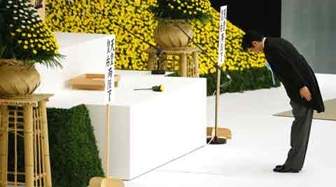 Japanese Prime Minister Shinzo Abe delivers a speech during a ceremony to mark the 70th anniversary of the bombing at the Hiroshima Peace Memorial Park in Hiroshima, western Japan Thursday, Aug. 6, 2015. (AP Photo/Eugene Hoshiko)