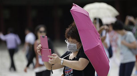 A visitor wearing mask as a precaution against Middle East Respiratory Syndrome (MERS) virus, takes a souvenir photo at the Gyeongbok Palace, one of South Korea’s well-known landmarks, in Seoul. (Source: AP)