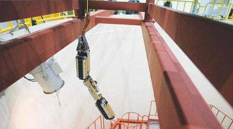 FILE – A remote-controlled robot that looks like an enlarged fibrescope being lowered through the mock-up of a primary containment chamber during a demonstration for media in February 2015. (AP Photo)