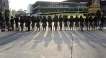 Thai soldiers stand in line blocking the entrance to the Army Club in Bangkok, Thailand (Source: AP)