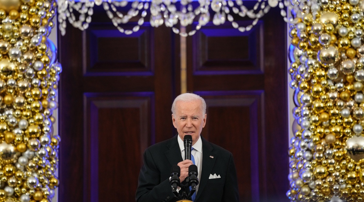 President Joe Biden speaks during a Hanukkah holiday reception in the Grand Foyer of the White House in Washington, Monday, Dec. 19, 2022. (AP Photo/Susan Walsh)