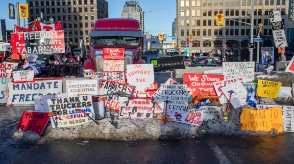 The streets of downtown Ottawa echo with chants and slogans steeped in the language of the American Revolution, right down to the Don’t Tread on Me pennants. “Freedom,” yells a man in a red mask waving a Canadian flag. “Freedom,” comes the ardent reply. Though the flag, it should be noted, was held aloft in a quintessentially Canadian fashion, attached to a hockey stick.