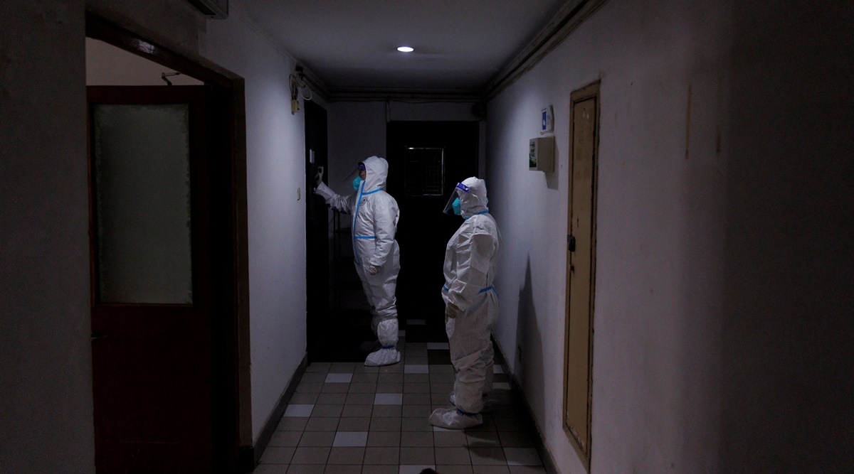 Pandemic prevention workers in protective suits knock on a resident's door in an apartment building that went into lockdown as coronavirus disease outbreaks continue in Beijing. (Reuters)