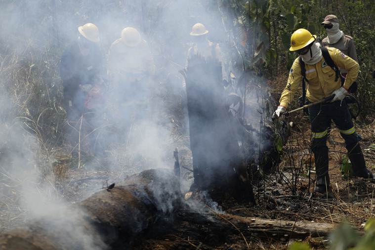 Firefighters put out fires in the Vila Nova Samuel region, along the road to Jacunda National Forest near the city of Porto Velho, Rondonia state, part of Brazil’s Amazon (AP)