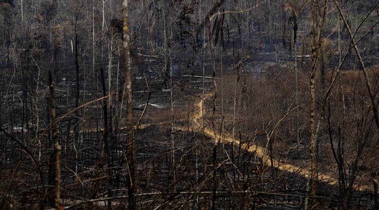 Charred trees stand as a forest fire sweeps through the Vila Nova Samuel region, along the road to the Jacunda National Forest near the city of Porto Velho, Rondonia state, part of Brazil’s Amazon (AP)