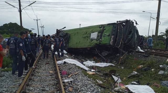 The tour bus was traveling with 65 passengers on board when it crossed the railway track during rain in Chacheongsao, 80 kilometers (50 miles) east of Bangkok, where a train smashed into the vehicle.
