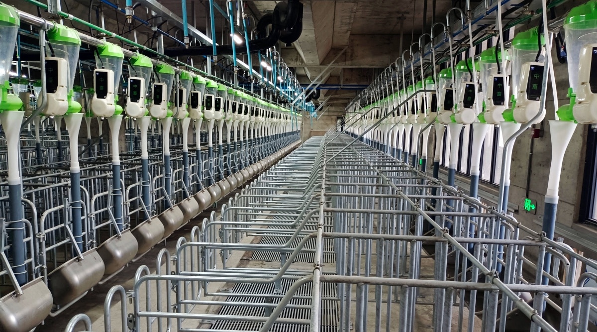 A photo provided by Hubei Zhongxin Kaiwei shows individual feeding stalls for female breeding pigs inside the company urban pig farm on the outskirts of Ezhou, China. (The New York Times)