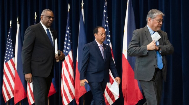 From left; U.S. Defense Secretary Lloyd Austin, Philippines Officer in Charge of the Department of National Defense Carlito Galvez and Philippine Secretary of Foreign Affairs Enrique Manalo leave the stage as they conclude a joint news conference together with U.S. Secretary of State Antony Blinken at the State Department, Tuesday, April 11, 2023, in Washington. (AP Photo) China warned on Wednesday that a deepening security alliance between the United States and the Philippines should not harm its security and territorial interests and interfere in long-simmering territorial disputes in the South China Sea.