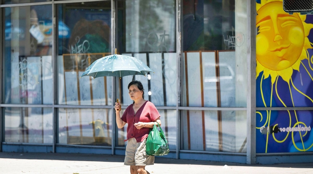 A woman finds shade in the midday heat from a parasol in North Hollywood, California, on July 19, 2023, as a heatwave continues. (Sarah Reingewirtz/The Orange County Register via AP)