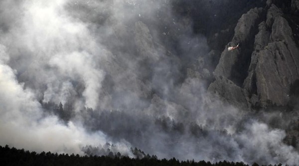 A helicopter flies above the smoke from the NCAR fire as it burns in the foothills south of the National Center for Atmospheric Research, Saturday, March 26, 2022, in Boulder, Colo. (AP)