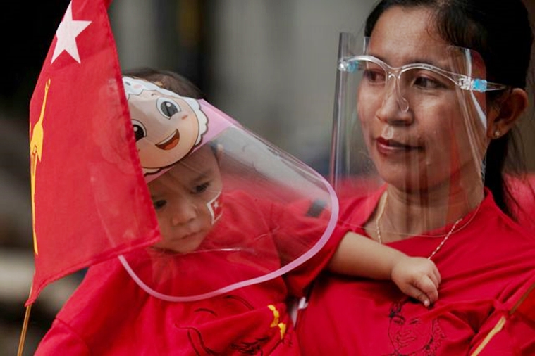 FILE PHOTO: A mother and her son hold a flag of National League for Democracy (NLD) party, amid coronavirus disease (COVID-19) spread concerns during an election campaign rally in Yangon, Myanmar, September 8, 2020. (Reuters)