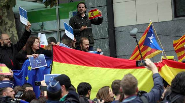 People hold Spanish and Catalonia indolence flags after a speech by sacked Catalonian President Carles Puigdemont in Brussels, Tuesday, Oct. 31, 2017. (AP Photo/Olivier Matthys)