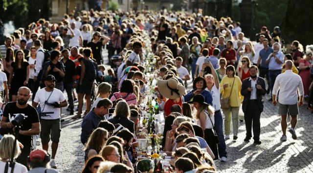 Residents dine at a 500-metre-long table spanning across the length of the medieval Charles Bridge as restrictions ease following the coronavirus disease (COVID-19) outbreak, in Prague, Czech Republic June 30, 2020. REUTERS/David W Cernyew