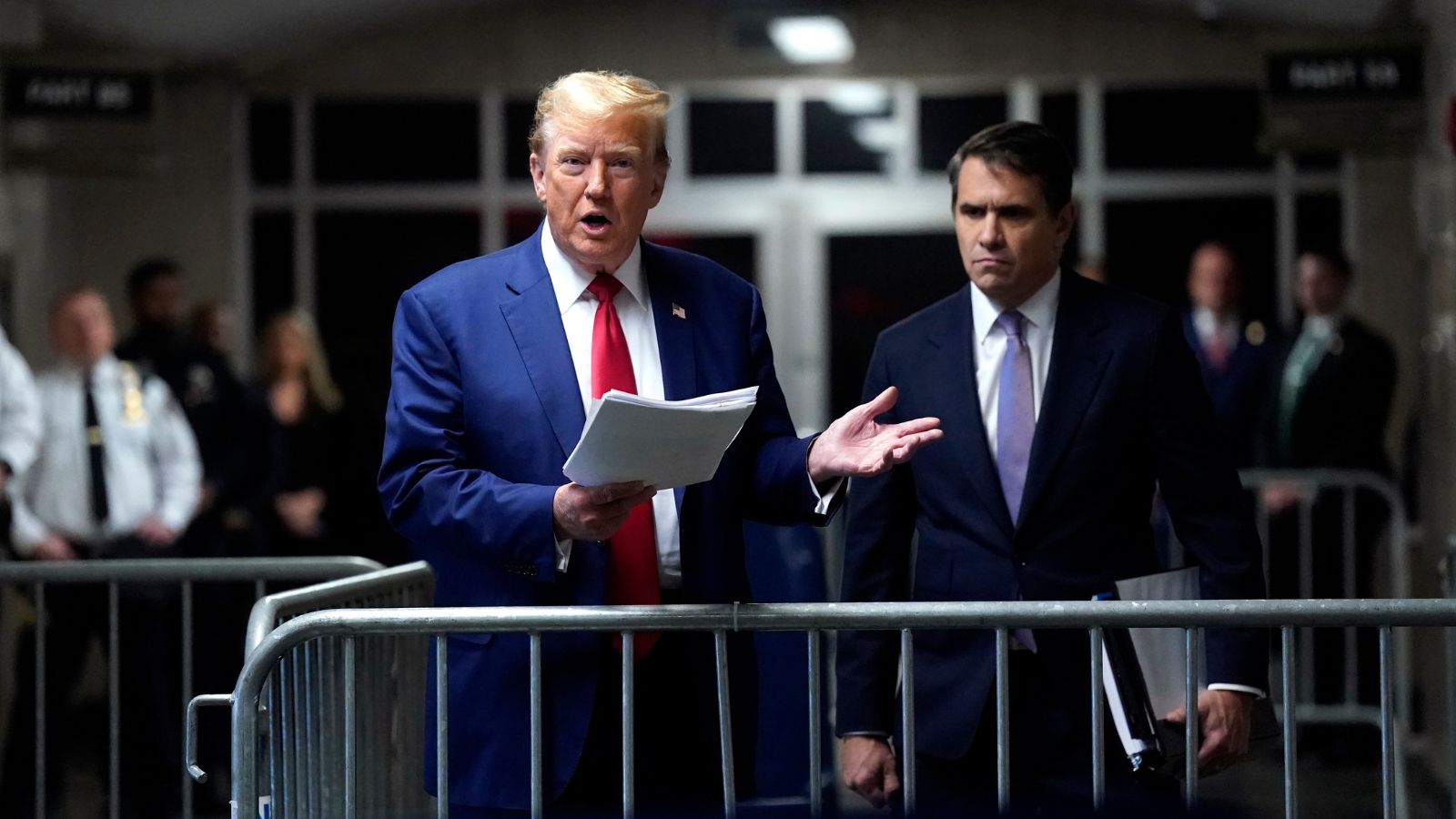Former President Donald Trump, with attorney Todd Blanche, right, arrives at Manhattan criminal court in New York, on Friday, Friday, May 10, 2024. (Timothy A. Clary/Pool Photo via AP)