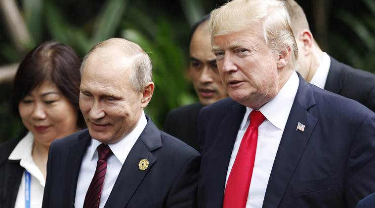 U.S. President Donald Trump, right, and Russia’s President Vladimir Putin, center, talk during the family photo session at the APEC Summit in Danang (AP/File)