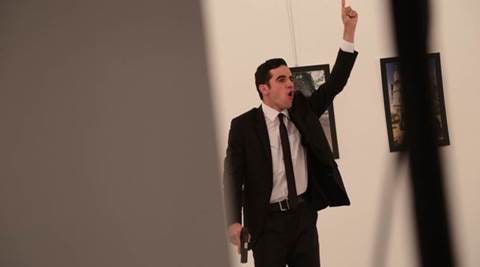 An unnamed gunman gestures after shooting the Russian Ambassador to Turkey, Andrei Karlov, at a photo gallery in Ankara, Turkey, Monday, Dec. 19, 2016. (Source: AP Photo/Burhan Ozbilici)