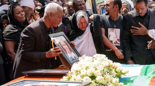 Thousands mourned the Ethiopian plane crash victims on Sunday, accompanying 17 empty caskets draped in the national flag through the streets of the capital as some victims’ relatives fainted and fell to the ground.