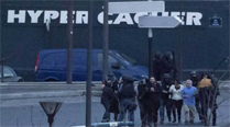 Security officers escort released hostages after they stormed a kosher market to end a hostage situation. (Source: AP)
