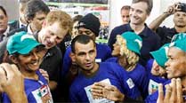 One of the men in the program is Helio Roque, who earns $7 a day cleaning streets. He clambered atop a trash can to grab a glimpse of the prince.