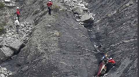Rescue workers work on debris at the plane crash site near Seyne-les-Alpes after the Germanwings jetliner crashed in the French Alps. (Source: AP)