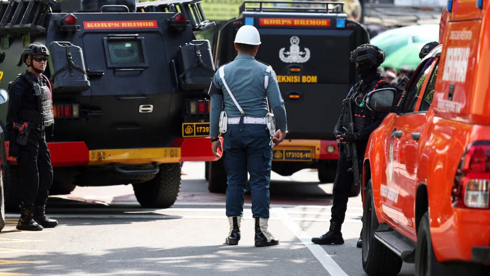 Armed police personnel and military personel guard near an area after an explosion occurred at a school complex in Jakarta, Indonesia (REUTERS) Dozens were injured and taken to hospitals after an explosion ripped through a mosque inside a school complex during Friday prayers in Jakarta, Reuters reported.