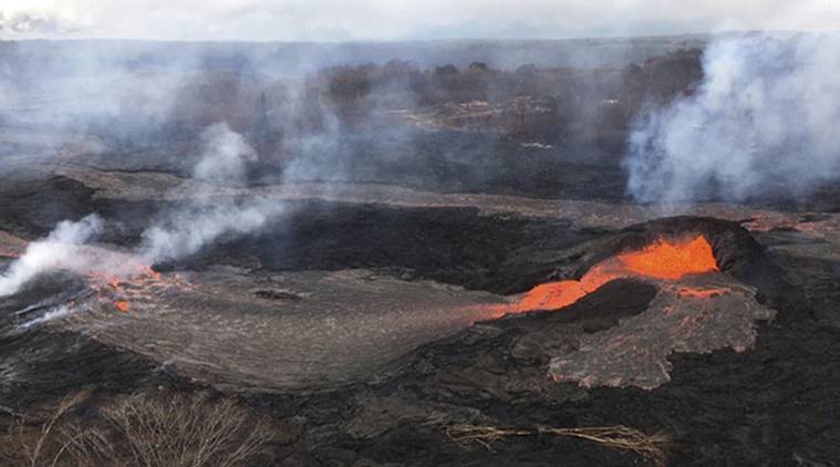 Lava fountains have built a small spatter cone, the black mound at right, from which lava spills out onto the surface and flows into a small pond at left, in Kilauea Volcano near the town of Pahoa on the island of Hawaii Friday, May 25, 2018. (U.S. Geological Survey via AP)