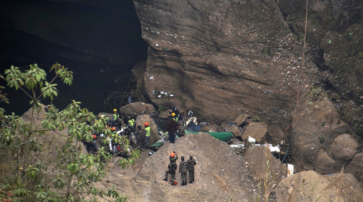 Nepalese rescue workers inspect wreckage at the site of a plane crash in Pokhara, Nepal. (AP) A spokesman for Nepal’s Civil Aviation Authority says a flight data recorder and a cockpit voice recorder have been retrieved from the site of the crash of a passenger plane that went down on approach to a newly opened airport in the tourist town of Pokhara.
