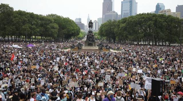 Aerial footage released by a local TV news station shows thousands of demonstrators gathered at the steps of the Philadelphia Museum of Art to protest against the custodial killing of unarmed African American George Floyd. The protestors on Saturday marched from the museum to City Hall and back to rally against police brutality, The New York Times reported.