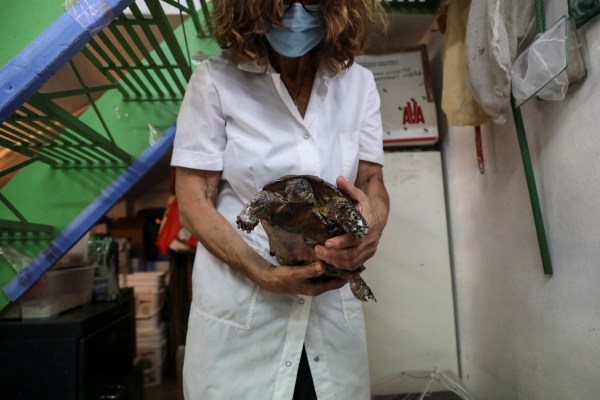 Hellenic Wildlife Care Association ANIMA president Maria Ganoti holds an injured turtle following a wildfire north of Athens, at ANIMA’s first aid centre, in Athens, Greece, August 8, 2021. (Reuters)