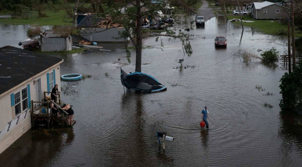 A man walks back to his home after sharing fuel with his neighbors, to use for their generator, in the aftermath of Hurricane Ida in Cut Off, Louisiana, U.S., August 30, 2021. Picture taken with a drone. (REUTERS/Adrees Latif)