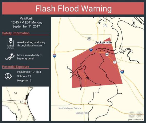 4:45 pm: The National Weather Service in Jacksonville issued a Flash Flood warning for Cental Duval County in northeastern Florida until 12.45 pm EDT, Monday. Areas near the St Johns River are under the threat of flash floods as the water is expected to rise another 1 to 2 ft when winds switch and push water northward and the high tide begins to come into river.