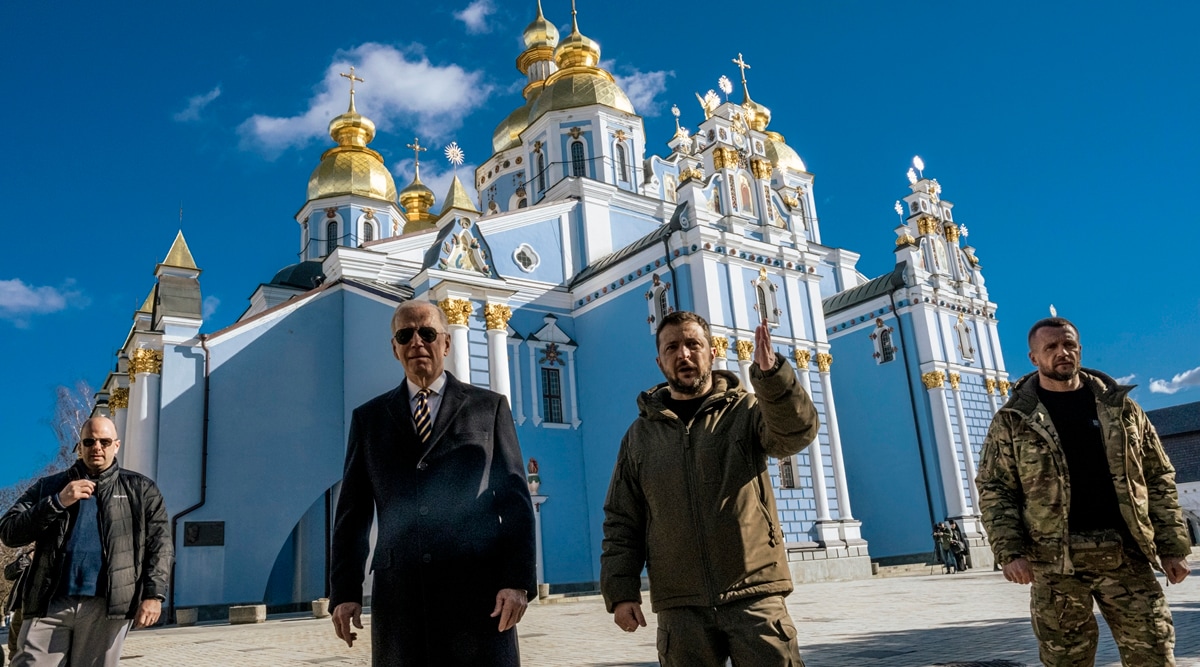 President Joe Biden, left, is escorted by President Volodymyr Zelenskyy of Ukraine as he visits St. Michael's Golden-Domed Monastery in Kyiv, Ukraine's embattled capital, on Monday, Feb. 20, 2023. (Daniel Berehulak /The New York Times)Written by David E. Sanger and Anton Troianovski