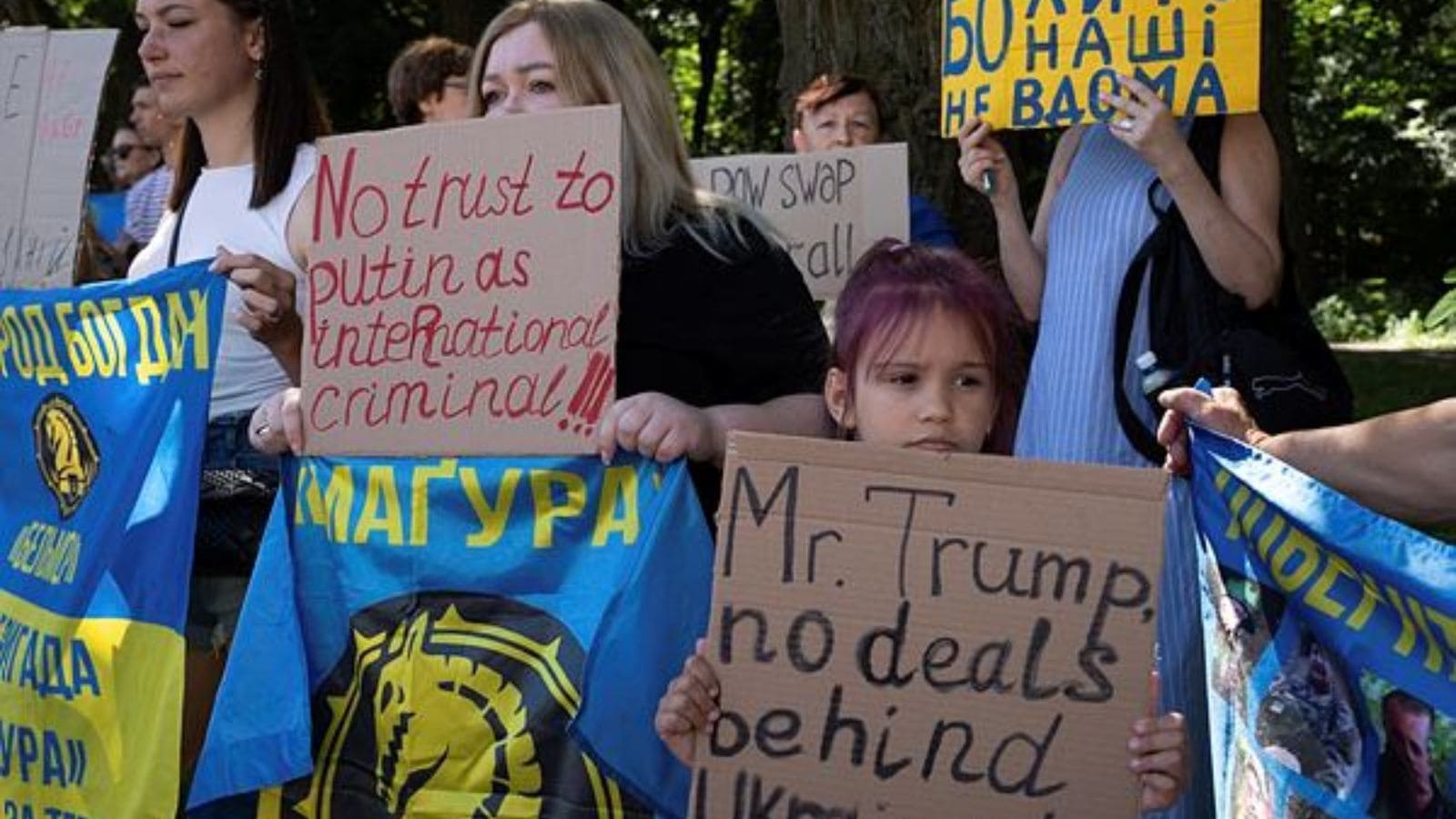 People attend a rally ahead to the meeting between U.S. President Donald Trump and Russian President Vladimir Putin, during a rally in front of the U.S. Embassy in Kyiv, Ukraine, Friday, Aug. 15, 2025. (AP Photo)