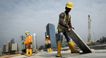 Migrant workers from India construct a road leading to the Financial District, background, in Singapore. (AP)