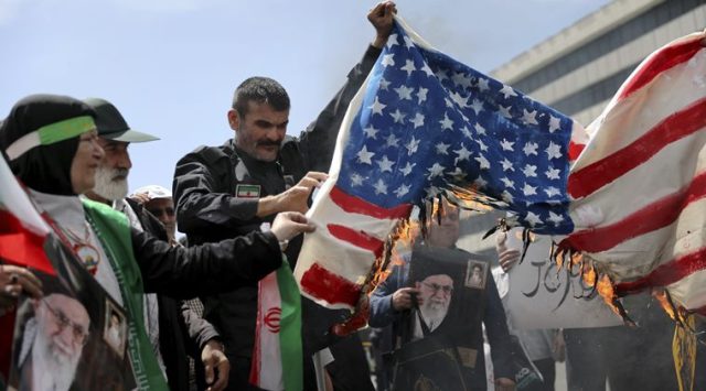 Iranian worshippers burn a representation of a US flag during a rally after Friday prayer in Tehran, Iran, Friday, May 10, 2019. (AP Photo)