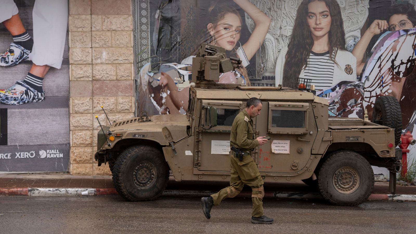 An israeli soldier pass by an army vehicle in tin Kiryat Shmona on the day that the ceasefire between Israel and Hizballa began, northern Israel, Wednesday, Nov. 27, 2024. (AP Photo/Ohad Zwigenberg)